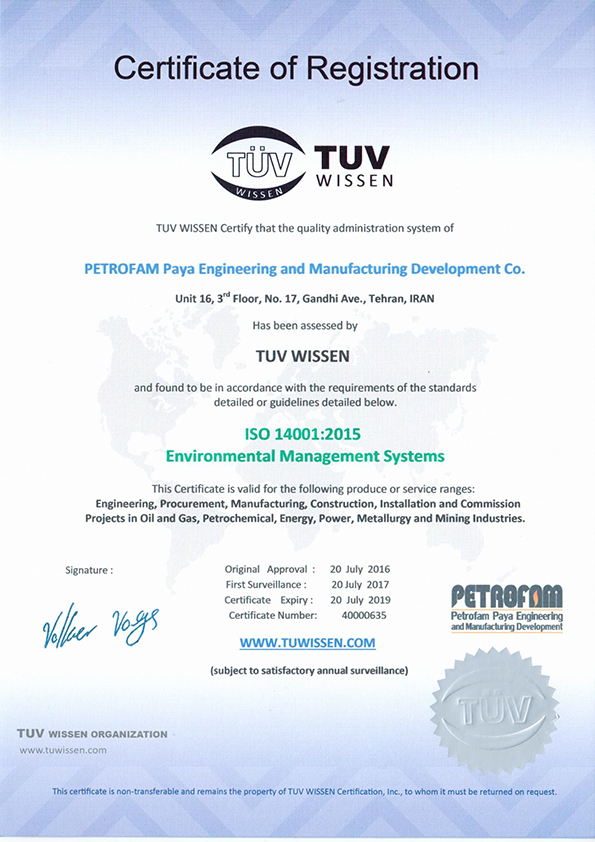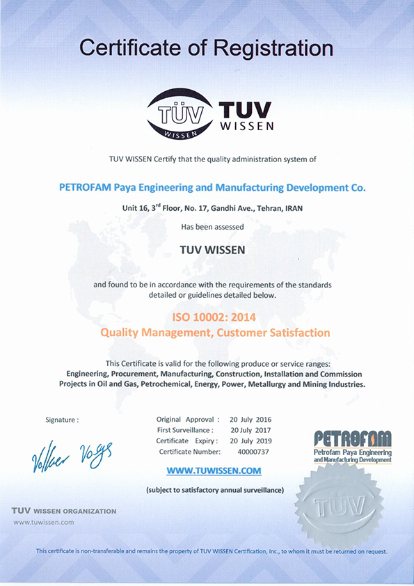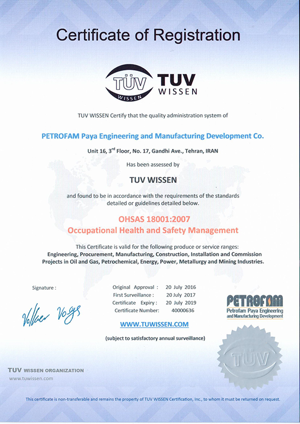 Petrofam below certificates are valid for the following produce or service ranges: