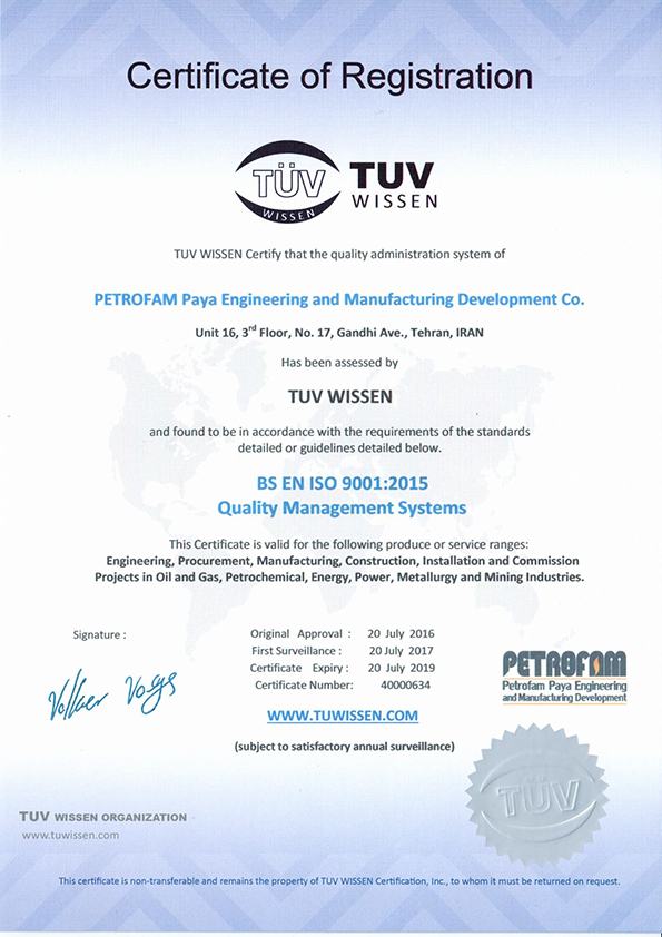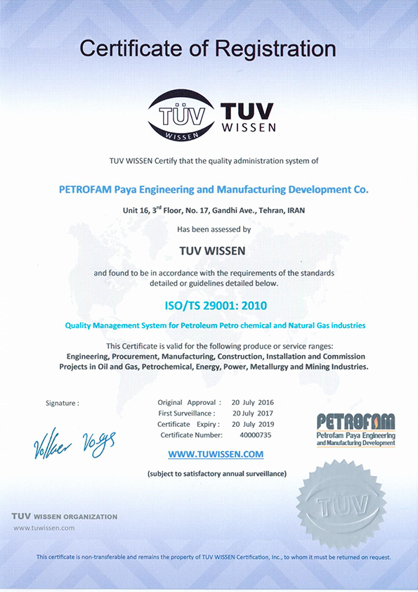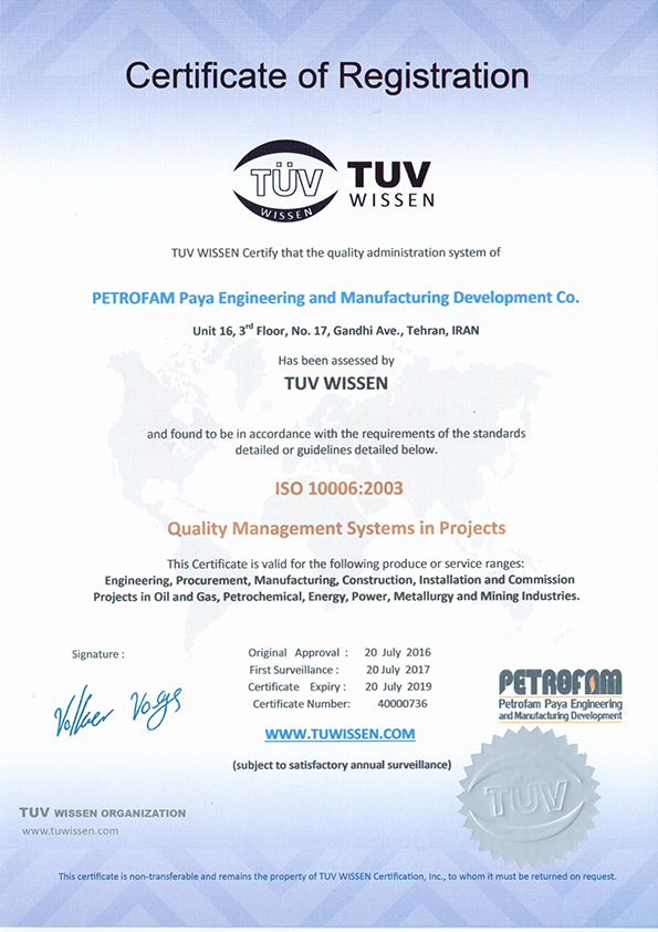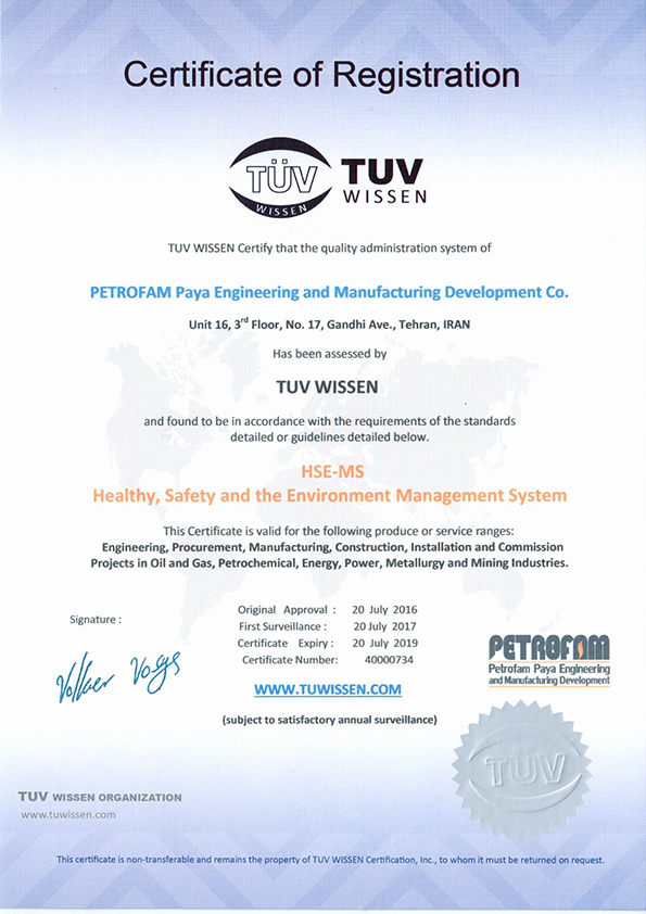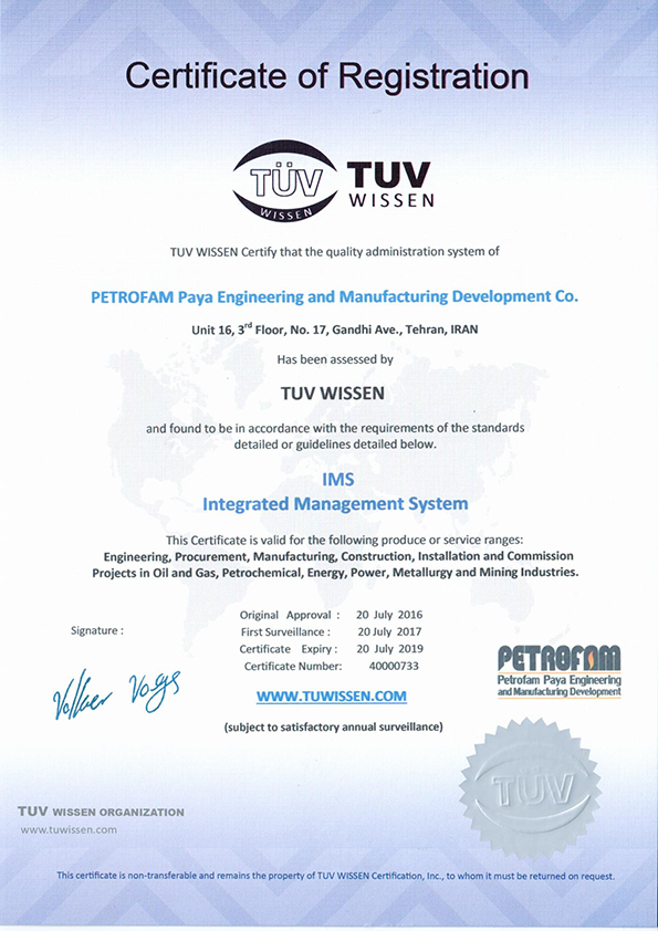 Petrofam below certificates are valid for the following produce or service ranges: